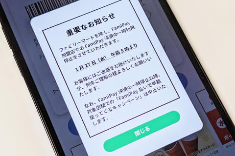 ファミリーマートのスマホアプリ「ファミペイ」は、26日から発生しているシステム不具合の為、FamiPay決済(ファミリーマート、オンライン決済以外での支払)の利用を27日午前5時から停止。飲食店、家電量販店で展開している「FamiPay払いで半額戻ってくる」キャンペーンについても中止とした。